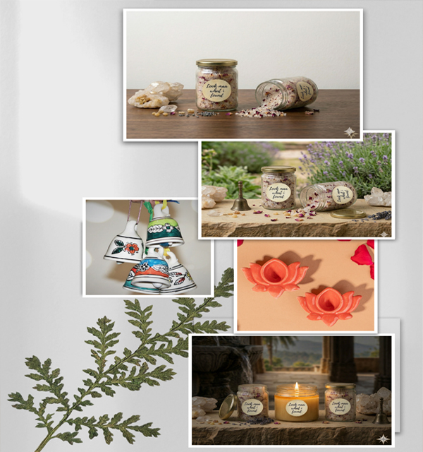 Our offerings include beautifully curated gift hampers as well as individual treasures such as Aura Cleansing Camphor, Soothing Massage Candles, Therapeutic Bath Salts, Handcrafted Ceramic Bells, and Elegant Ceramic Diyas-each designed to elevate everyday rituals into moments of self-care.